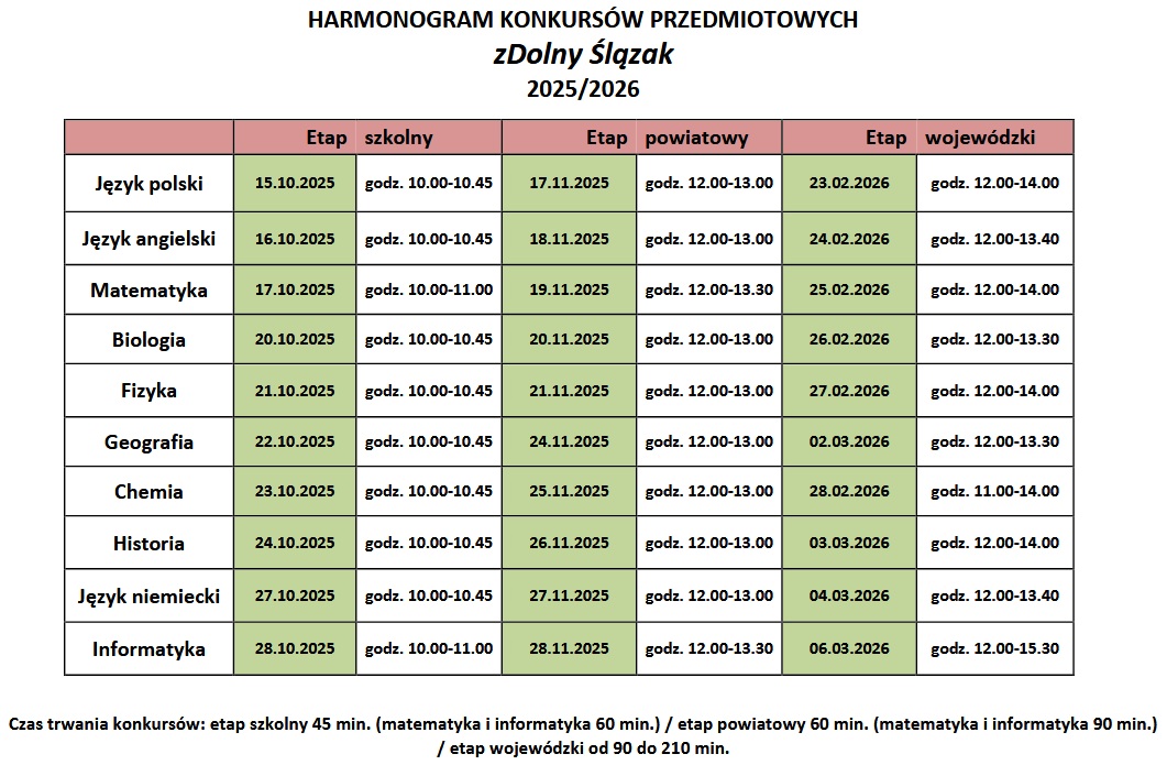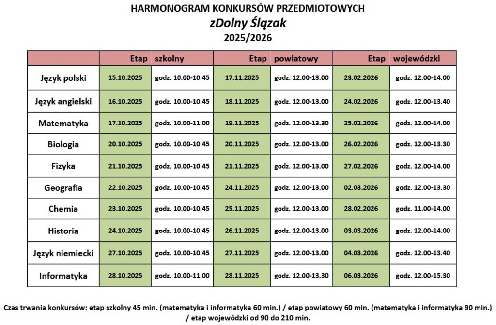 W naszej szkole można przystąpić do konkursów z języka polskiego, języka angielskiego, języka niemieckiego, matematyki oraz historii. Więcej informacji u nauczycieli przedmiotów i na stronie https://zdolnyslazak.edu.pl/